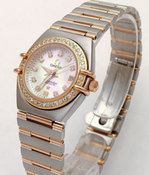 Стильная женская модель копии часов Omega Constellation My Choice, застежка браслета с кнопочным блокиратором, перламутровый цыферблат, по ободу цырконы, покрытие-розовое золото, механизм Rondo (Швейцария).